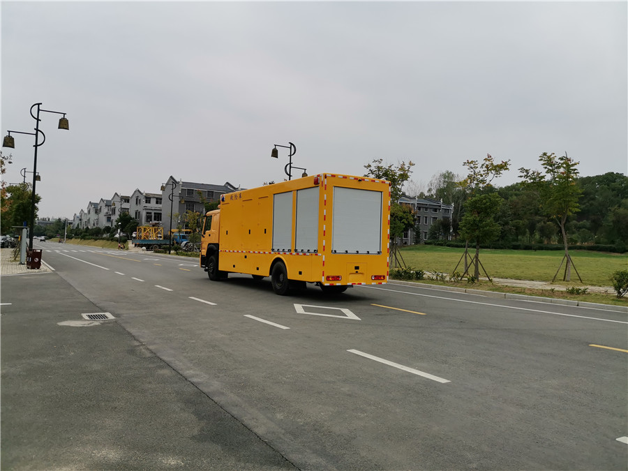 选装配置:选装行李架、爬梯、车顶工作台;选装不同形状、结构的警示灯;选装中隔断(可选择开门)、车身两侧可选开上掀门、盲窗、侧开门;花纹铝板;加装设备工具柜、配电箱、发电机组、水泵、电焊机、空压机等线路安装外接电源系统、(室内灯光照明、探照灯、高杆照明灯等);绕线盘,还可根据用户不同需求加装不同的维修抢险设备、车身制作专用图案或标识。