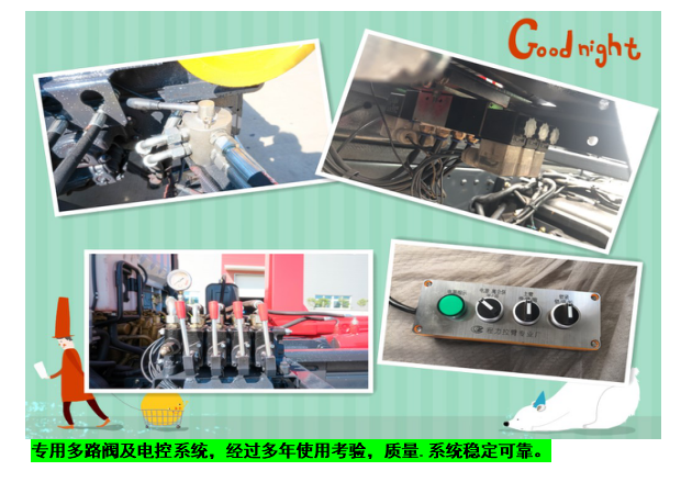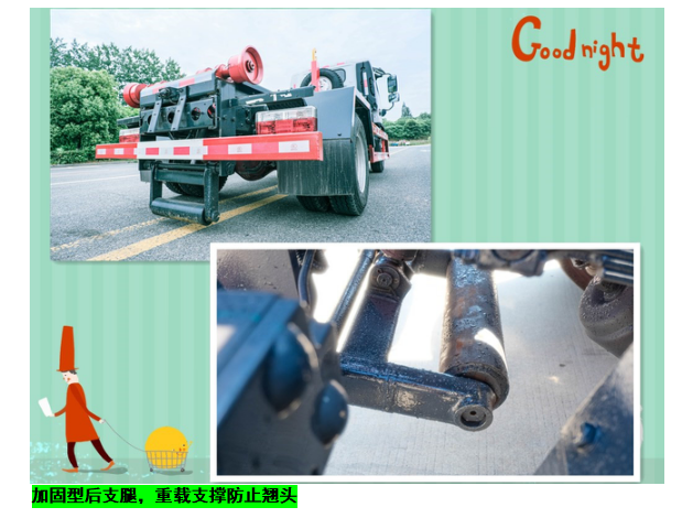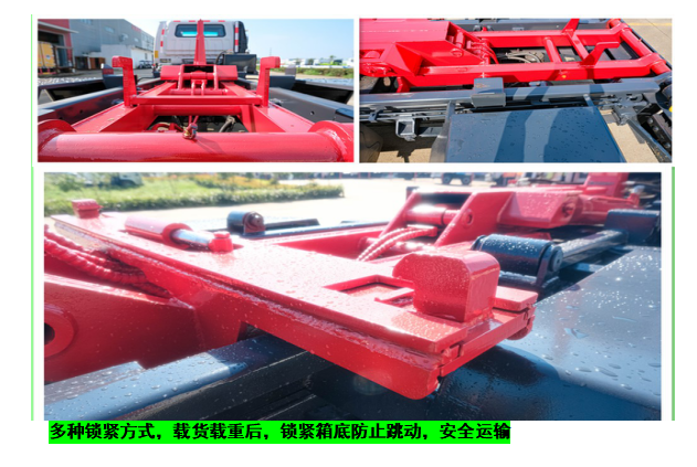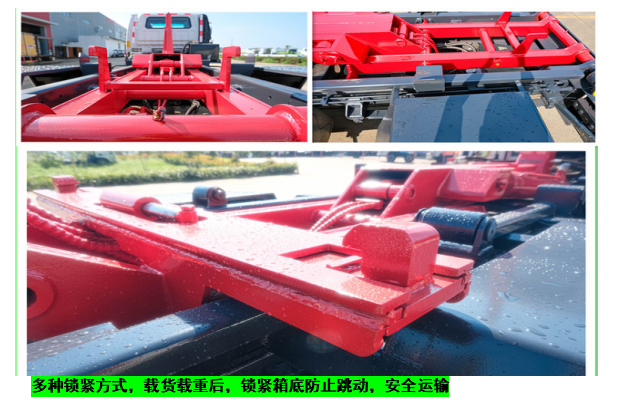 ◇上装配置:强度合金钢一体式主勾臂,加强型副梁,铸钢尾托轮,手自一体室内外液压操控,上装提升能力3000KG, 液压完成上箱+下箱+锁紧+自卸等作业,实现一车配多箱的循环转运。可采用加强型上装,油缸加粗,加装液压支腿,搭配建筑垃圾箱使用,提升能力6000Kg。