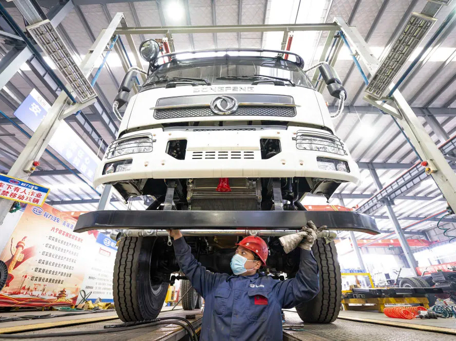 工作人员在湖北程力集团下线的成品车前巡查。新华社记者肖艺九 摄