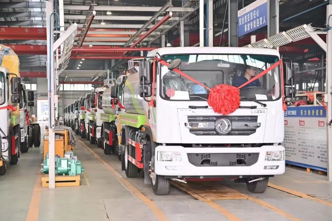 图六(上):程力汽车公司洒水车生产线上,一辆辆接连下线的洒水车,犹如出征的战士,即将奔赴远方,为抗击高温酷暑提供坚实的