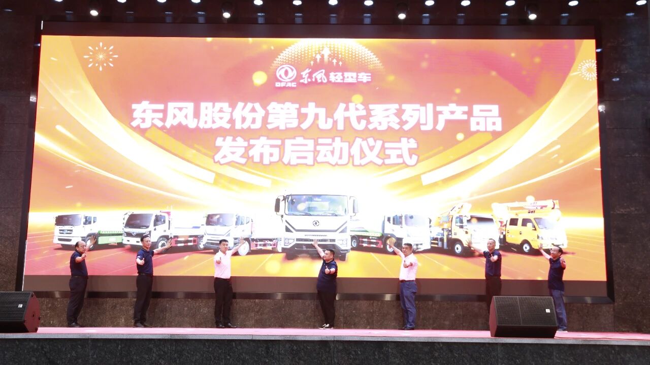 随后,程力汽车集团公司董事长程阿罗(中)、东风股份营销总部专用车战略大区总监王意翔(左三)、东风股份营销总部专用车随州大区总监顾浩(右三)、程力集团党委书记袁昌才(左二)、集团总经理朱武(右二),集团副总刘峰(左一)、倪文进(右一),共7位领导嘉宾上台参与了程力东风股份第九代新产品发布的启动仪式。